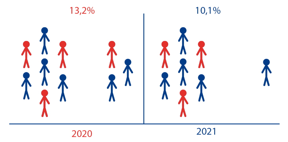 Der durchschnittliche Zeitraum der Beschäftigung unserer Mitarbeitenden seit Eintritt lag in 2021 bei 9,7 Jahren im Vergleich zu 10,2 Jahren im Vorjahr. Die Fluktuation verringerte sich von 13,2 Prozent im Jahr 2020 auf 10,1 Prozent im Jahr 2021.