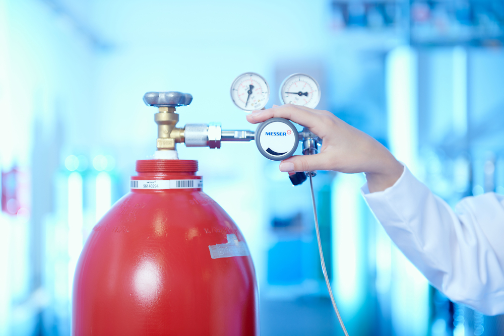 In general, pressurized gas cylinders should be positioned outside of work areas. With a central gas supply, the gas cylinders are placed in a separate room or even outside the building. The cylinders are connected to a pressure control panel of the central gas supply system, consisting of a pressure regulator, pressure gauges for indication of cylinder and line pressure as well as purge and shut off valves. The central gas supply also includes fixed pipelines for the supply of gas to the individual points of use, where the gas consumers are connected via tapping points. At the tapping point the line pressure is reduced to the required working pressure. A pressure gauge indicates the current working pressure.